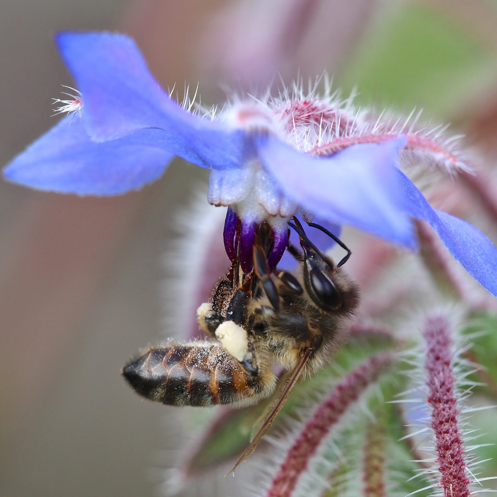 I have noticed a lot of white pollen coming into the hives and wasn't sure where it was coming from until I looked closely at these bees. The various pollen colour charts I found online all say that borage pollen is blue/grey, without offering any evidence. However, borage pollen is clearly white.