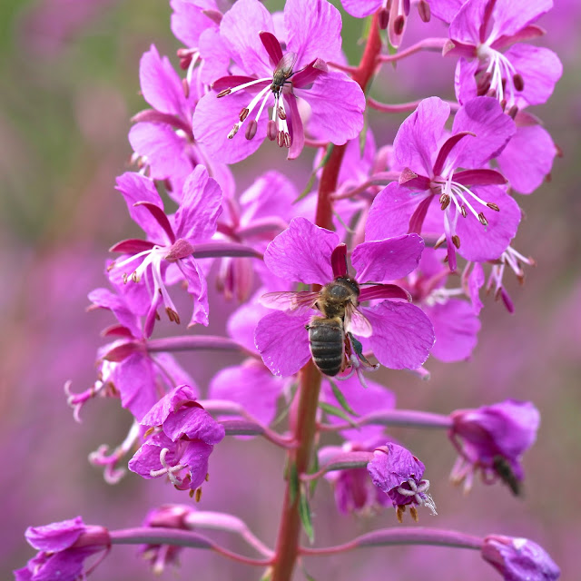 Rosebay willowherb (Chamaenerion angustifolium) is in full flower just now and is a common sight along roadside verges. In the US it is known as fireweed because it colonises areas burnt by forest fires. It is popular with all types of bees and both pollen and nectar are collected by honey bees. Although the flowers are a vivid pink the pollen is blue. Honey bees mix the pollen with a little nectar to pack it tightly in their pollen baskets (corbiculae) so it looks a bit darker.